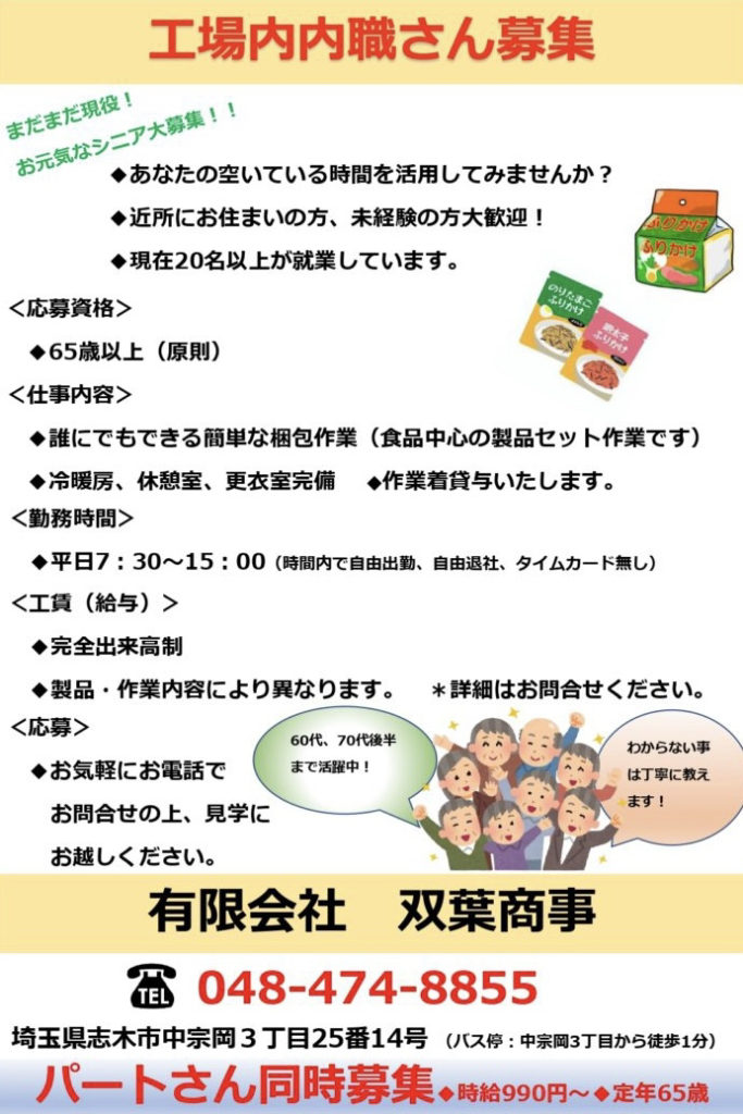 タグ: 求人チラシ, A4印刷, 志木市, チラシ印刷 志木市, ポスティング 印刷 志木市, ポスティング業者 志木市, ポスティング 志木市, チラシ配り 志木市, 全戸配布, 0484748855, パート募集, 工場 求人, ポスティング単価 志木市, パート募集 志木市, 有限会社双葉商事, 埼玉県志木市中宗岡3-25-14
