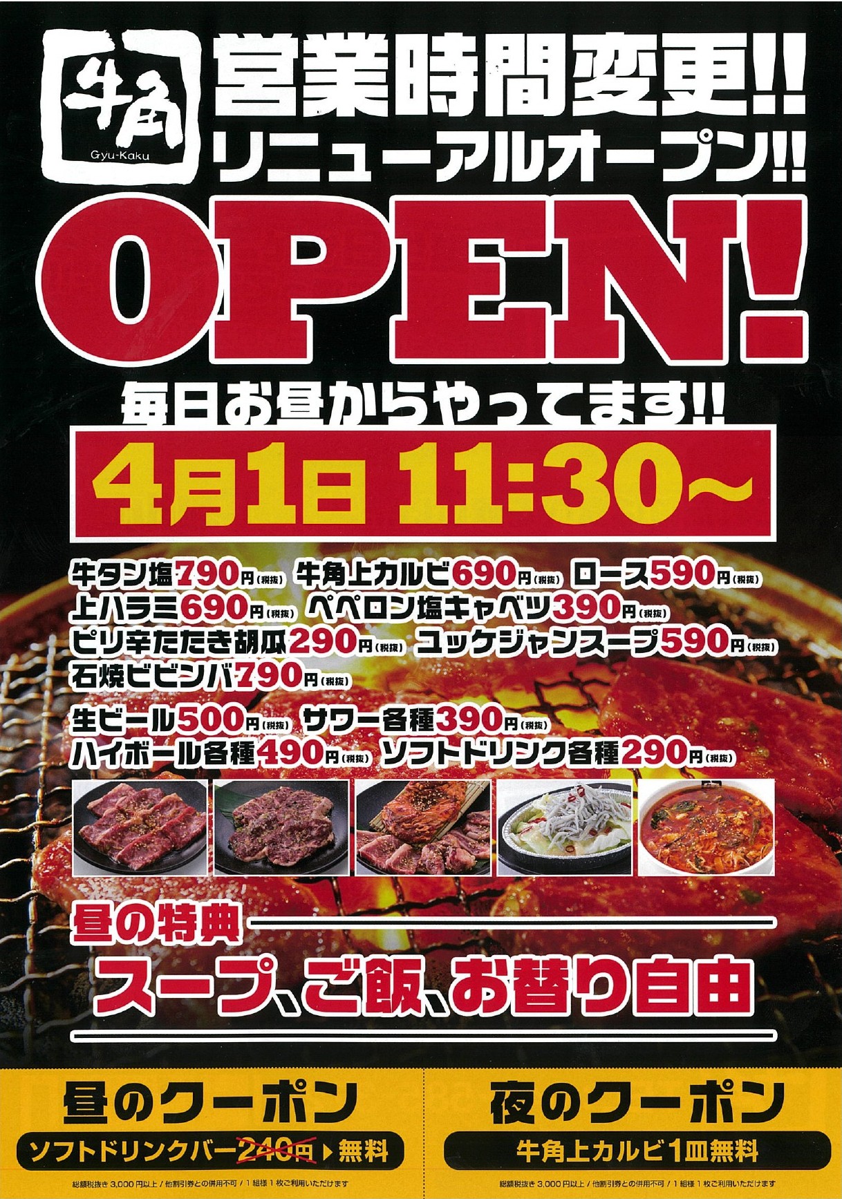 チラシ内容:リニューアルオープン・営業時間変更・メニューのご紹介
